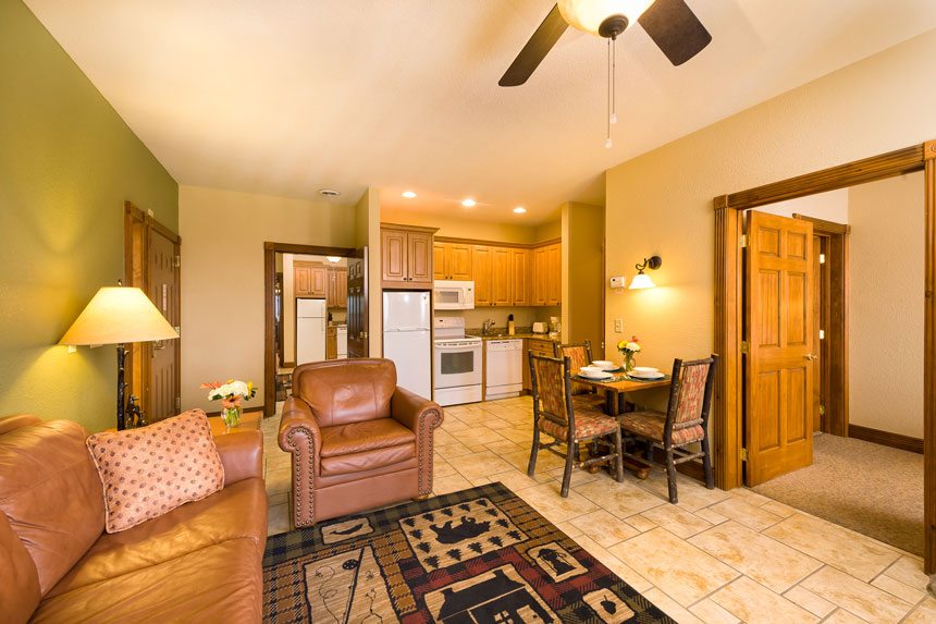 In addition to 1,230 square feet of space and room for up to 8 guests, the spacious Two-Bedroom Villa features multiple amenities, including two bedrooms, two bathrooms, a kitchen, fireplace, and balcony or patio area. Guests also enjoy access to a washer/dryer.